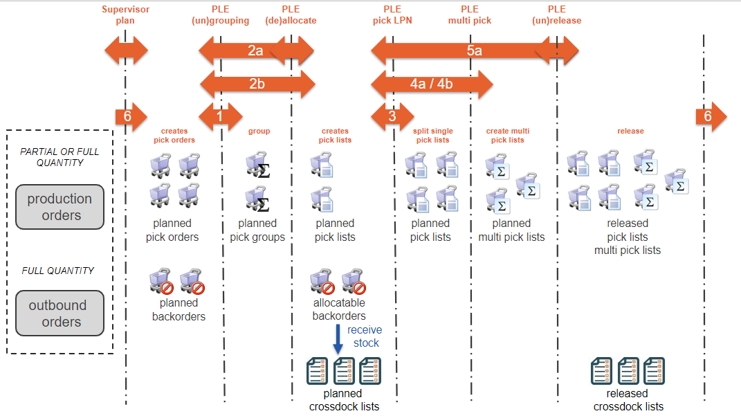 2a. Pick orders/pick groups are allocated. If there are shortages, allocatable backorders are created. PLE can deallocate pick orders or pick groups under certain circumstances.​
