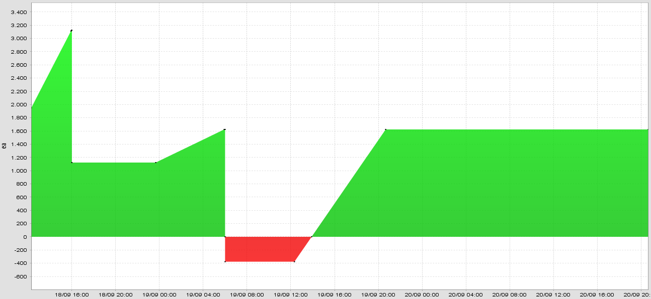 • Planned consumption of raw materials during production is represented by a downward trend (inventory drops gradually)