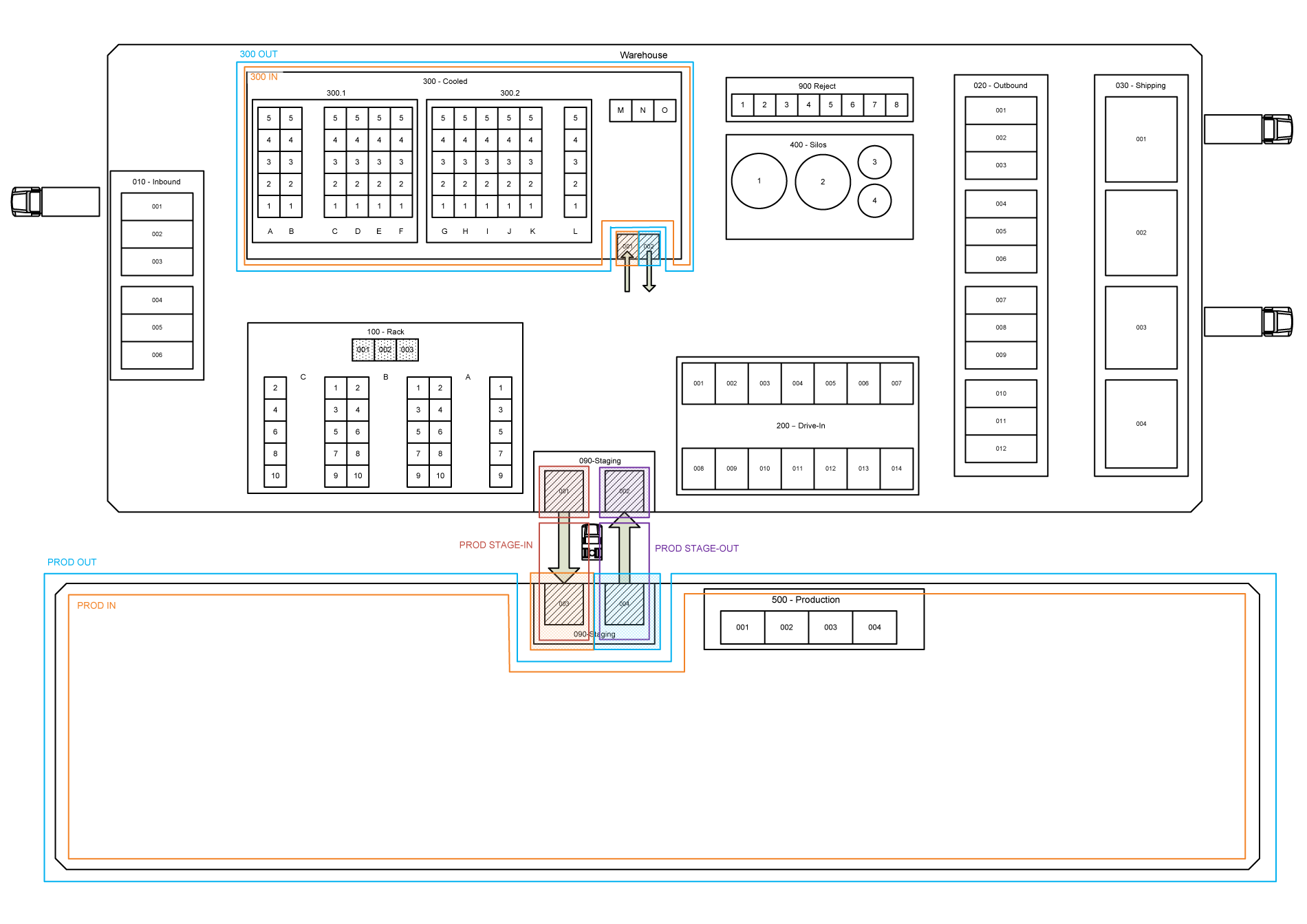 The logical organization of the warehouse in storage zones and work zones is set in Objective.