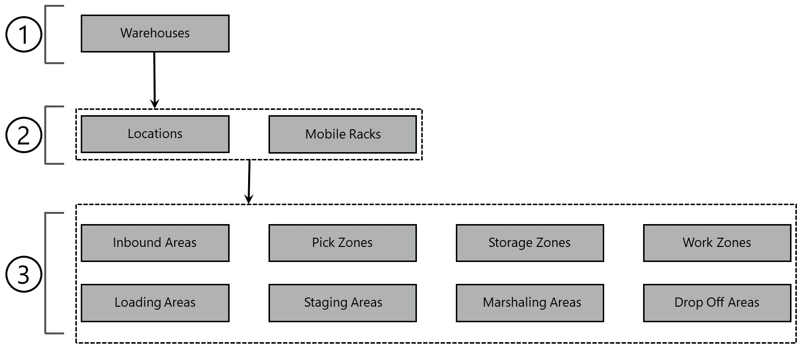 A warehouse (1) can have one or more loading areas (2). The loading areas (2) contain one or more loading locations (3) or loading docks where goods can be loaded.