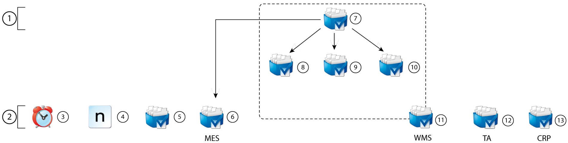Next, configure the elements Schedules (3), Number Sequences (4), General Settings (5), MES Settings (6), WMS Settings (11), TA Settings (12) and CRP Settings (13).