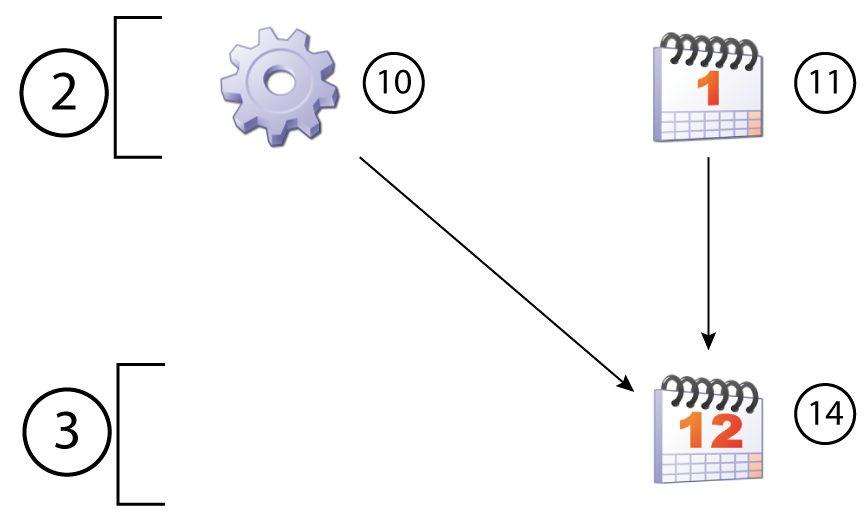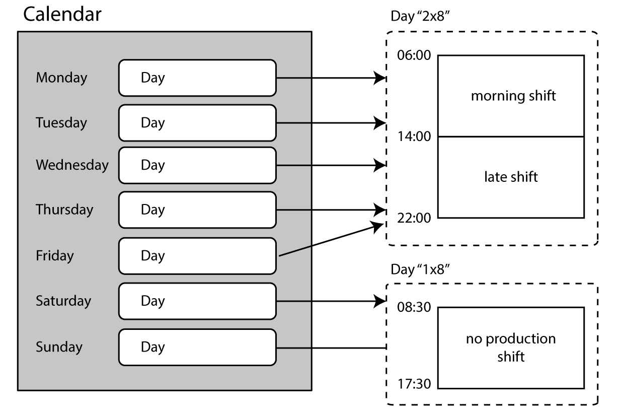 First, configure the Resource Types (10) (machines, work centers) and the Days (11). Then configure the Calendars (14).
